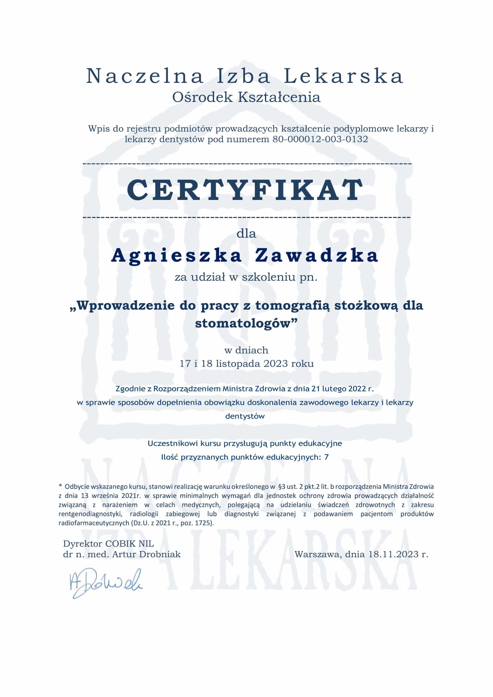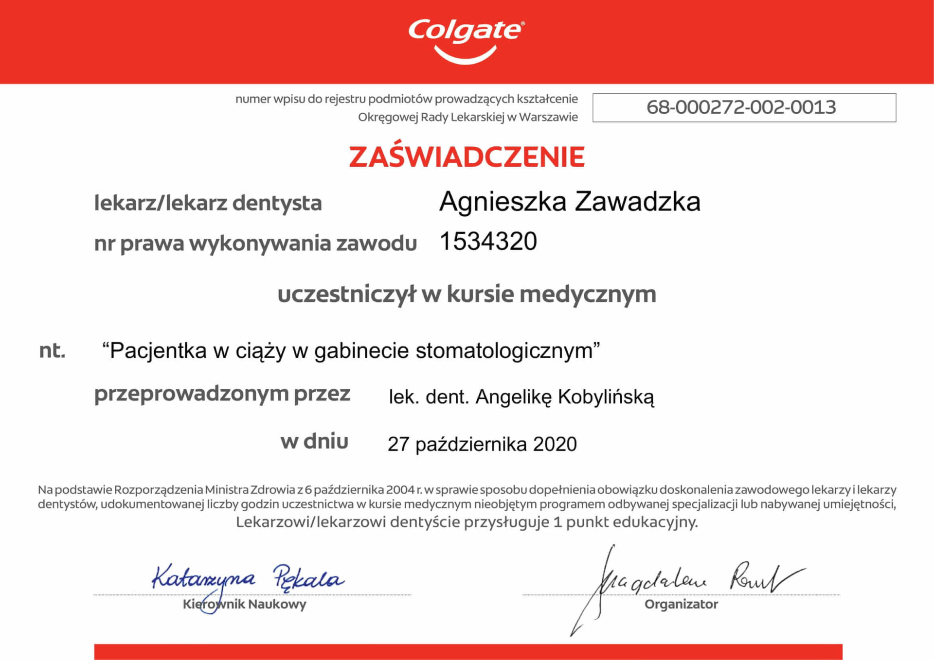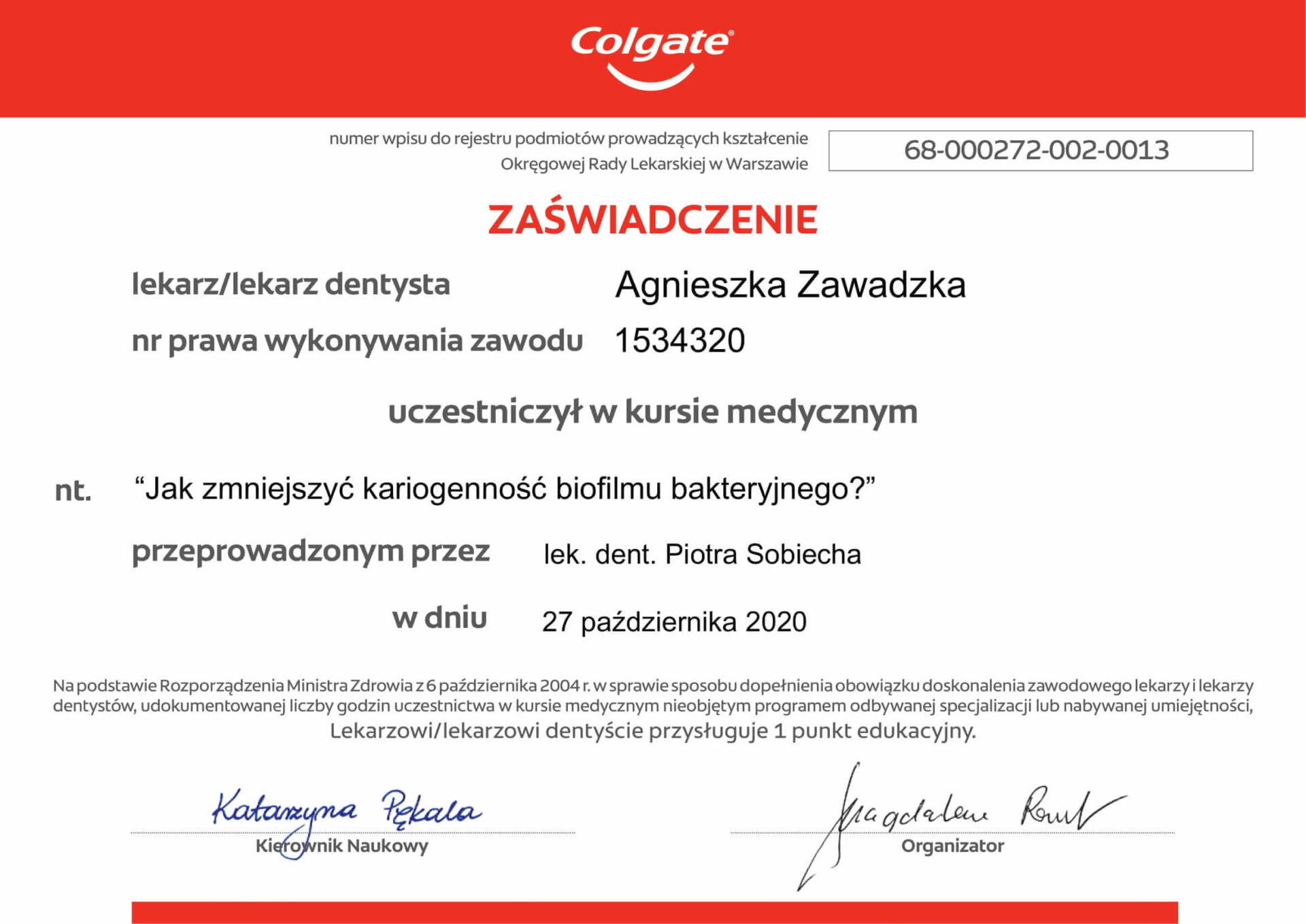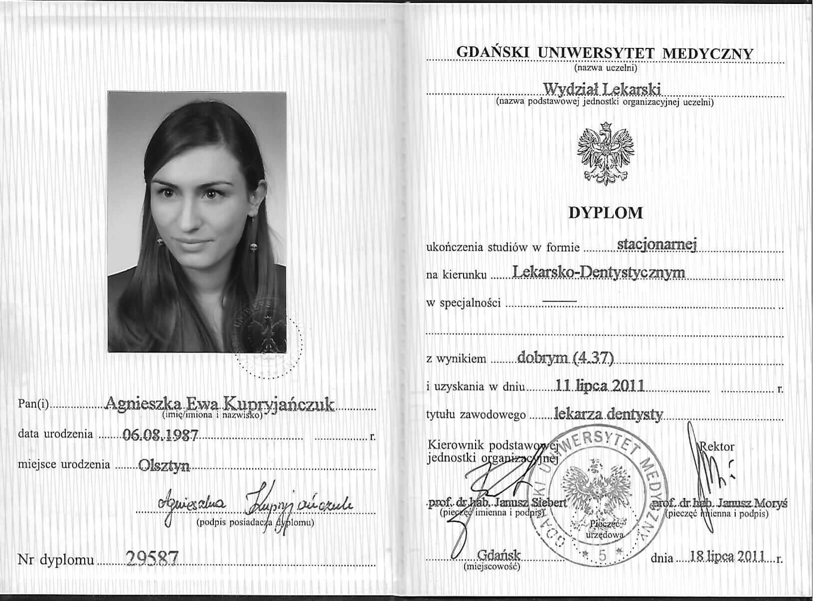 Pani doktor ukończyła Uniwersytet Medyczny w Gdańsku w roku 2011. Pierwsze lata ścieżki zawodowej poświęciła leczeniu najmłodszych pacjentów i w 2017 roku uzyskała tytuł specjalisty stomatologii dziecięcej. Od kilku lat zajmuje się kompleksową opieką stomatologiczną pacjentów dorosłych w tym leczeniem próchnicy, leczeniem kanałowym pod mikroskopem i estetycznymi odbudowami zębów.